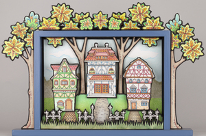 2024Houten dioramabakje met illustraties op MDF, uitgezaagd in 3D.