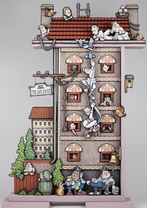 2021Houten dioramabakje met illustraties op MDF, uitgezaagd in 3D.